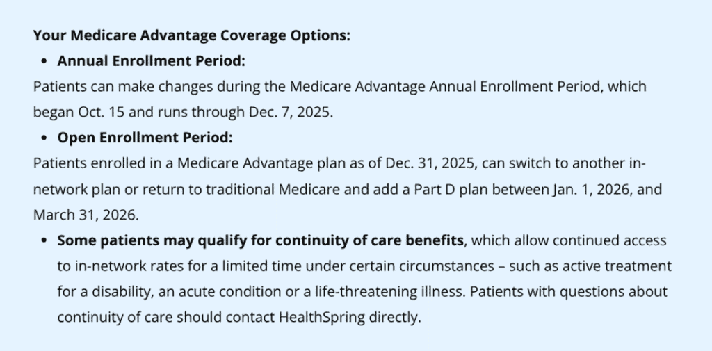 This message is an important update regarding our network status with Cigna Healthcare Medicare Advantage. If you have this coverage, please read the following: